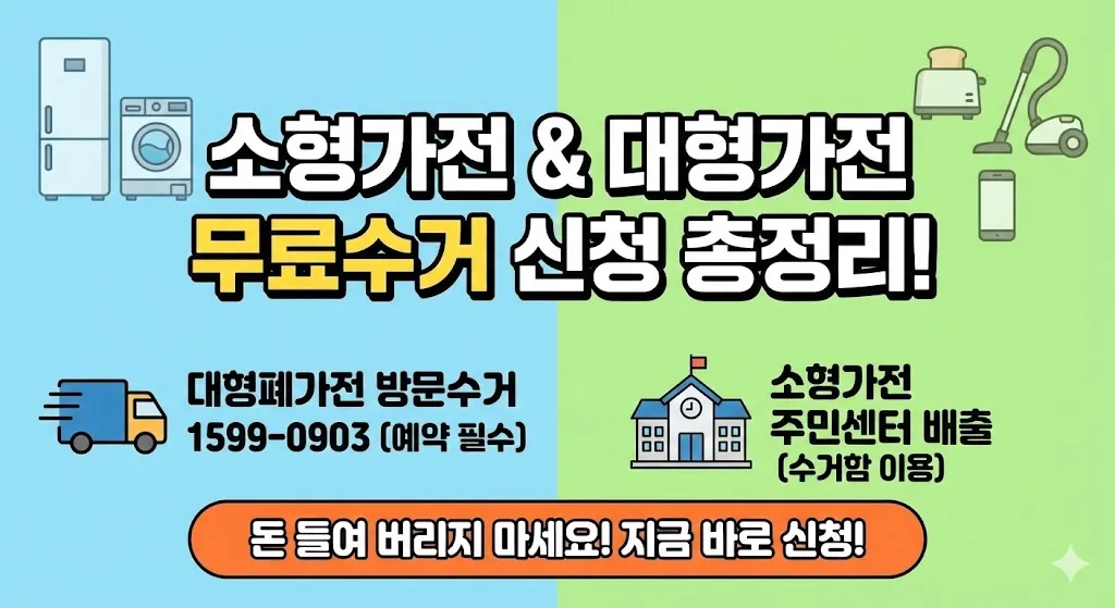 소형가전 무료수거 방법을 찾고 계신가요? 고장난 선풍기, 청소기, 전기밥솥 등 소형가전은 동주민센터 수거함에 무료로 배출하거나, 5개 이상일 경우 e순환거버넌스(1599-0903)를 통해 방문수거 신청이 가능합니다. 소형가전 무료수거 신청 방법, 대상 품목, 주의사항까지 상세히 정리했습니다.