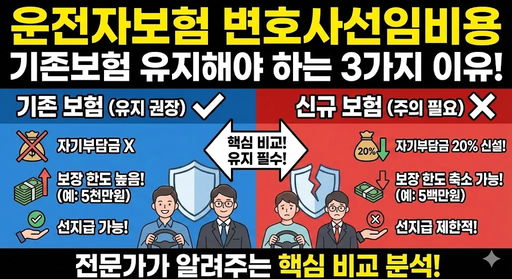 운전자보험 변호사선임비용 기존보험 유지에 대해 알아보겠습니다. 최근 운전자보험 시장에 자부담 도입, 보장 조건 변경 등 다양한 변화가 있으면서 기존 보험을 해지하고 신규 가입을 고민하는 분들이 많습니다. 하지만 섣부른 해지는 오히려 손해가 될 수 있습니다. 이 글에서는 운전자보험 변호사선임비용 기존보험을 유지해야 하는 3가지 핵심 이유를 상세히 정리했습니다.