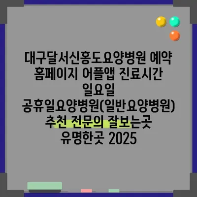 대구달서신홍도요양병원은 안전하고 편안한 요양 치료를 제공하는 곳으로, 많은 환자들에게 추천받고 있습니다. 예약은 홈페이지와 어플리케이션을 통해 간편하게 할 수 있으며, 언제 …