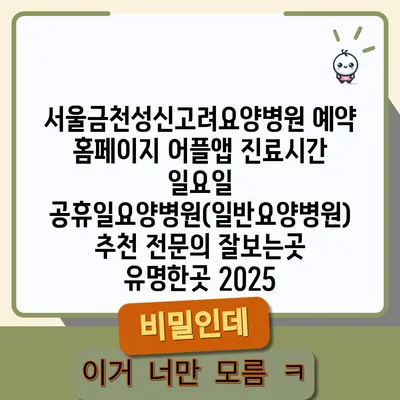 서울금천성신고려요양병원은 편리한 예약 홈페이지와 어플 앱을 통해 이용자의 편의를 높이고 있습니다. 이 병원은 진료 시간이 유연하여, 특히 일요일 및 공휴일에도 …