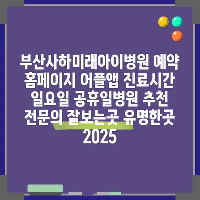 부산사하미래아이병원은 예약 홈페이지와 어플 앱을 통해 간편하게 진료를 예약할 수 있습니다. 특히, 진료시간이 유연하여 일요일 및 공휴일에도 운영되어 많은 부모님들에게 …