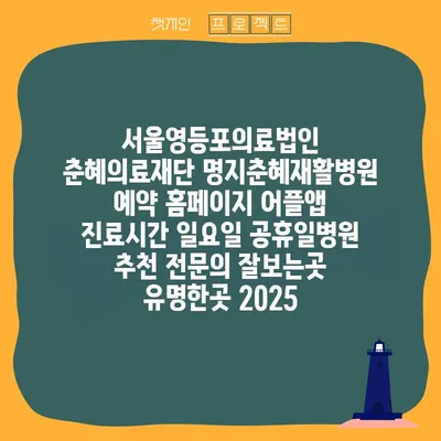 서울영등포의료법인 춘혜의료재단 명지춘혜재활병원은 재활치료 분야에서 가장 신뢰받는 병원 중 하나입니다. 병원의 예약 홈페이지와 어플 앱을 통해 간편하게 진료 예약을 할 …